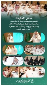 أقامت الجمعية حفل المعايدة السنوي لمنسوبيها ومنسوباتها بمناسبة عيد الفطر المبارك لعام 1447هـ، بحضور ومشاركة أمين عام الجمعية الأستاذ حمد بن محمد العيسى.