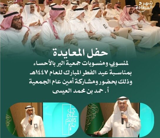 وشهد الحفل تبادل التهاني والتبريكات بين الحضور في أجواء سادها الود والتقدير، تفعيلاً لروابط التواصل الداخلي وتعزيزاً لبيئة العمل المحفزة، بما يسهم في تجديد الطاقات لمواصلة مسيرة العمل الخيري والتنموي التي تقودها الجمعية.